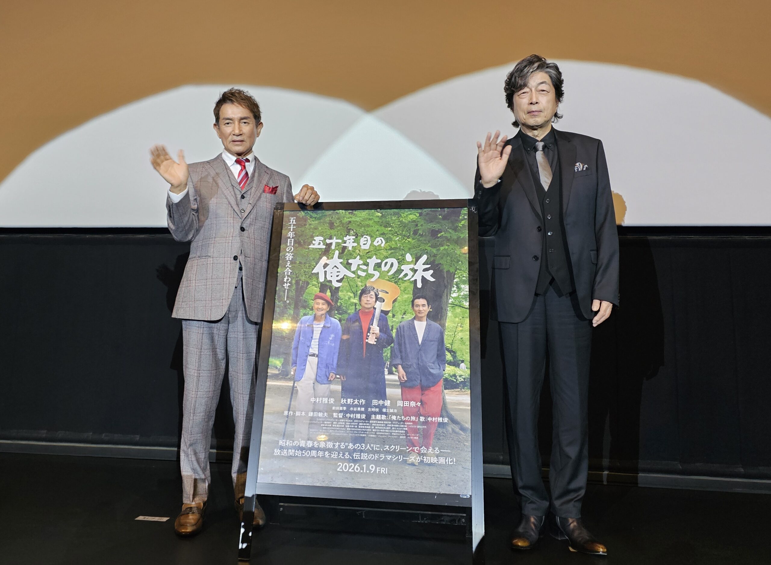 1975年10月から日本テレビ系列で放送された「俺たちの旅」。中村雅俊演じるカースケ、秋野太作演じるグズ六、田中健演じるオメダによる青春群像劇が、50周年を迎えた今、20年ぶりの続編『五十年目の俺たちの旅』として初めて映画版が製作された。監督・主演を務めた中村雅俊さん、田中健さんが、1月11日(日)、名古屋での舞台挨拶に登壇、50年の付き合いになるカースケとオメダの軽快なトークで満員の観客を楽しませた🎤
